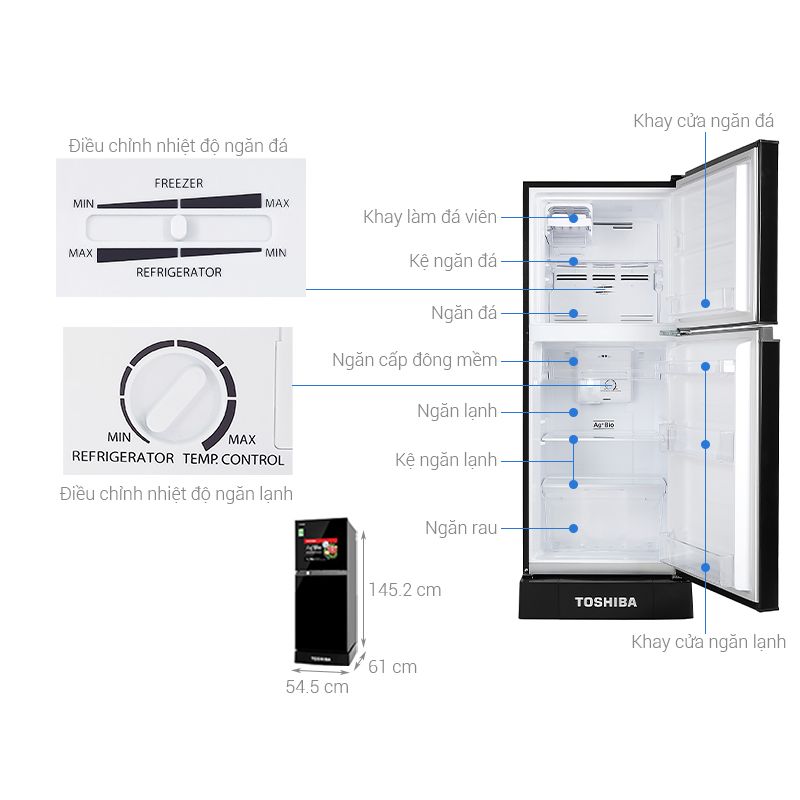 - Dung tích 194 lít: Phù hợp với gia đình 2 – 3 thành viên, bố trí ngăn đá 61 lít và ngăn mát 133 lít tiện lợi cho việc lưu trữ thực phẩm.